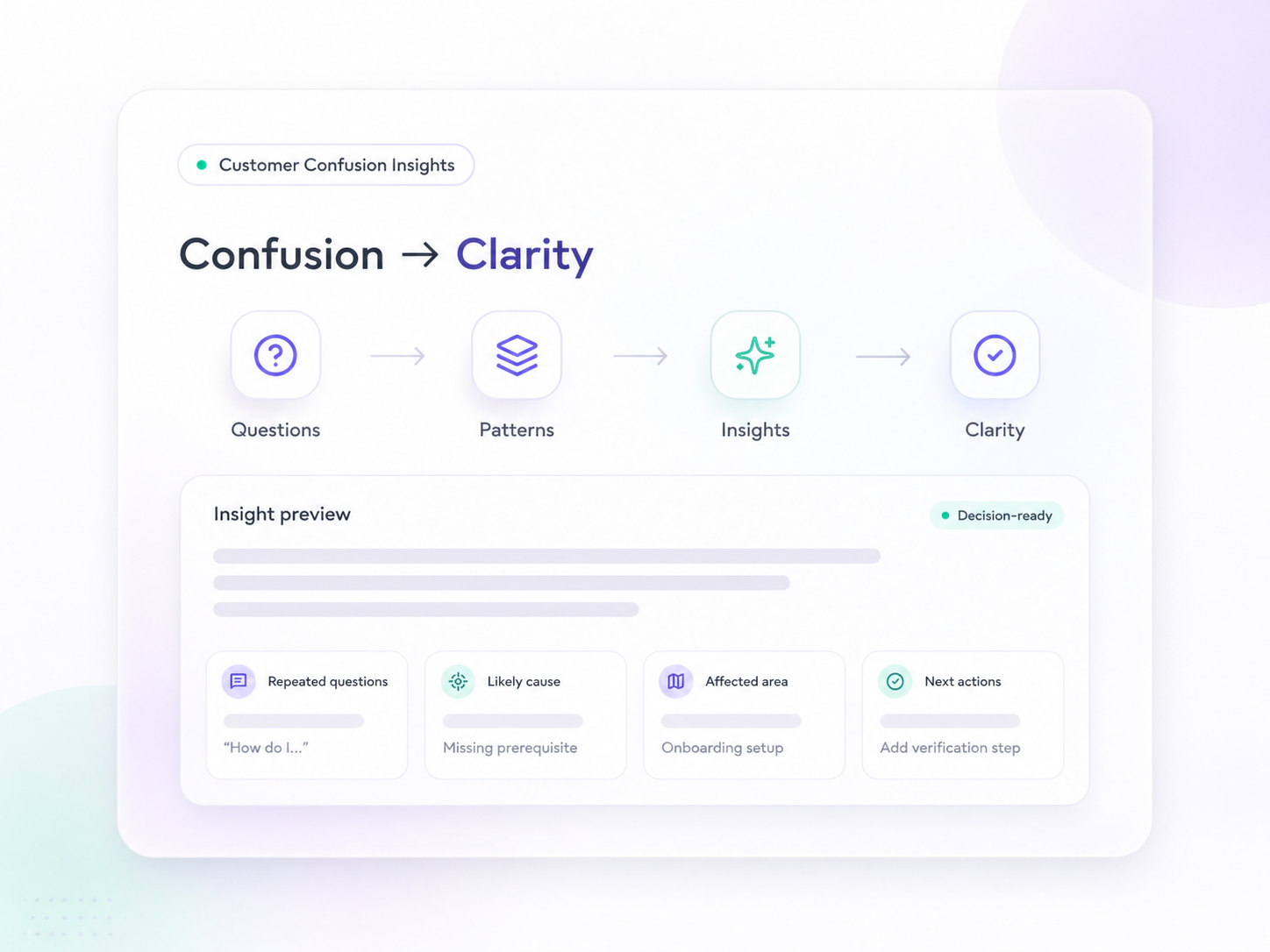 A single qualitative view of how users interpret your product — built from real questions, not assumptions.